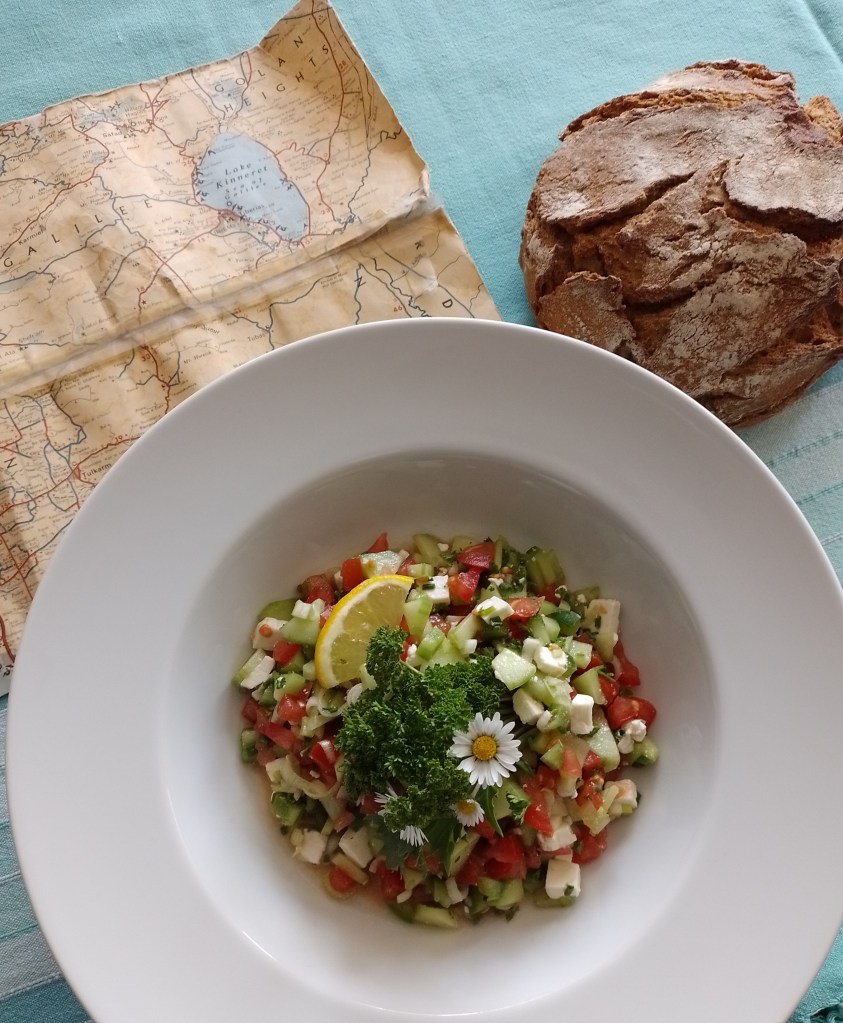 Alles mischen, kühl stellen und vor dem Servieren mit Minzeblättern oder Petersilie garnieren, mit Hummus (s. Beitrag „Ankunft in Erez-Israel), Brot oder Fingernudeln (Rezept unten) servieren.