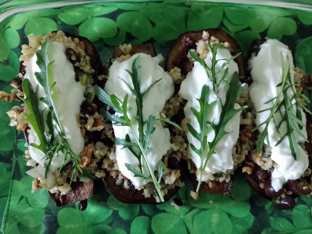 Die gegarten Auberginen auf vier Teller verteilen, den Bulgur darauf anrichten und mit dem Jogurt und dem Koriandergrün (Rucola passt auch – ich bekam wieder mal keinen frischen Koriander) garnieren, etwas Öl darüber träufeln und servieren.