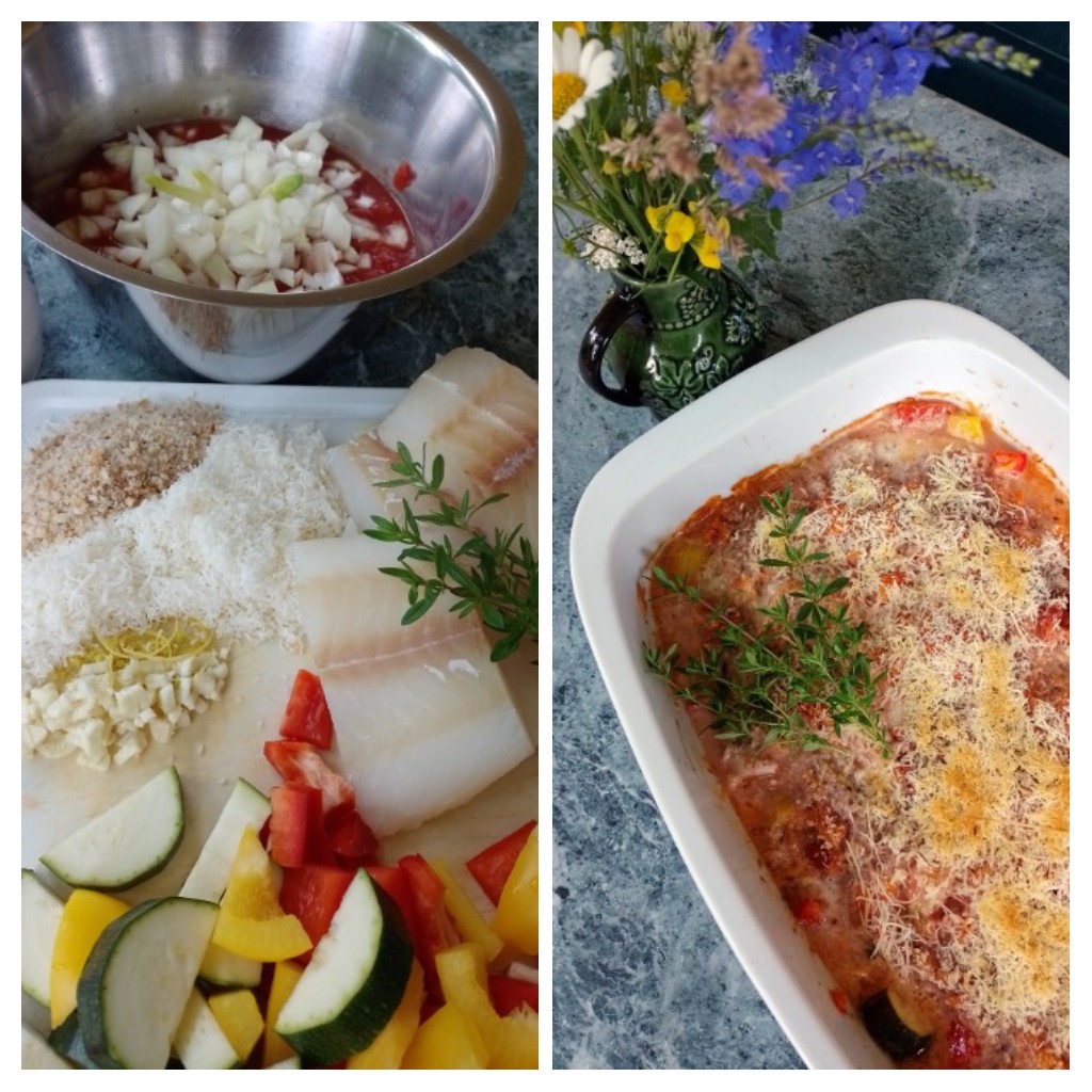 Fischfilet in Streifen schneiden, salzen und mit Zitronensaft beträufeln, mit in Stücke geschnittenen Paprikastücken und den Zucchinischeiben mischen und in eine gefettete, feuerfeste Form geben. Gestückelte Tomaten mit abgeriebener Zitronenschale, gehackter Zwiebel, Knoblauch und den Gewürzen vermischen und mit Salz abschmecken. Mehl mit Sahne verrühren und mit der Tomatenmasse vermischen und über den Fisch gießen, Semmelbrösel und Käse darüber streuen und im Ofen 20 – 25 Minuten bei 200 Grad backen. Mit Weiß- oder Fladenbrot servieren.