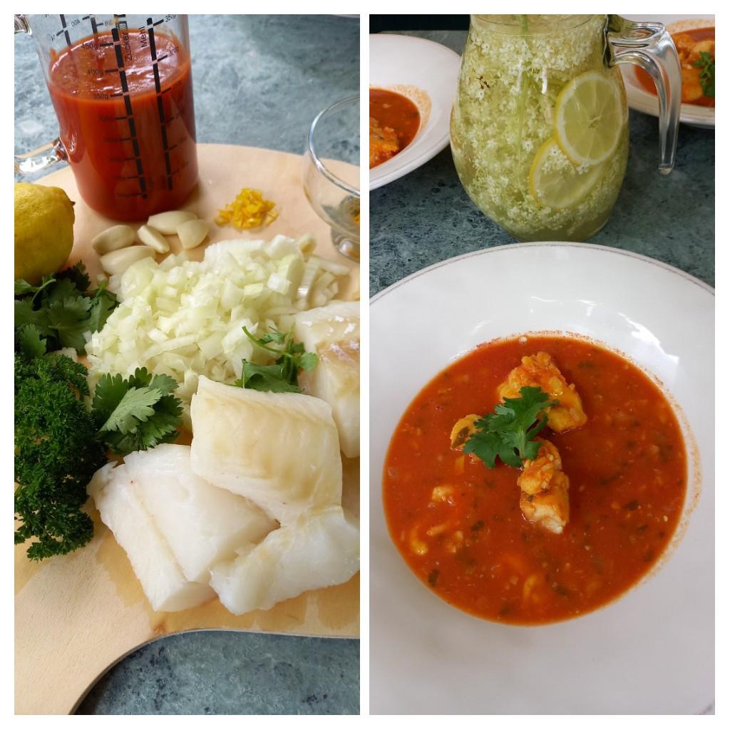 Tomaten und alles andere außer dem Fisch in einem großen Topf zum Kochen bringen. Vom Feuer nehmen und die Fischfilets in die heiße Sauce legen. Wieder erhitzen und bei schwacher Hitze 5 Minuten sanft köcheln lassen bis der Fisch gar ist. Sauce nach Geschmack mit mehr Zitronensaft abschmecken. Heiß oder kalt mit Brot und einem wohl temperierten spanischen Rotwein servieren.