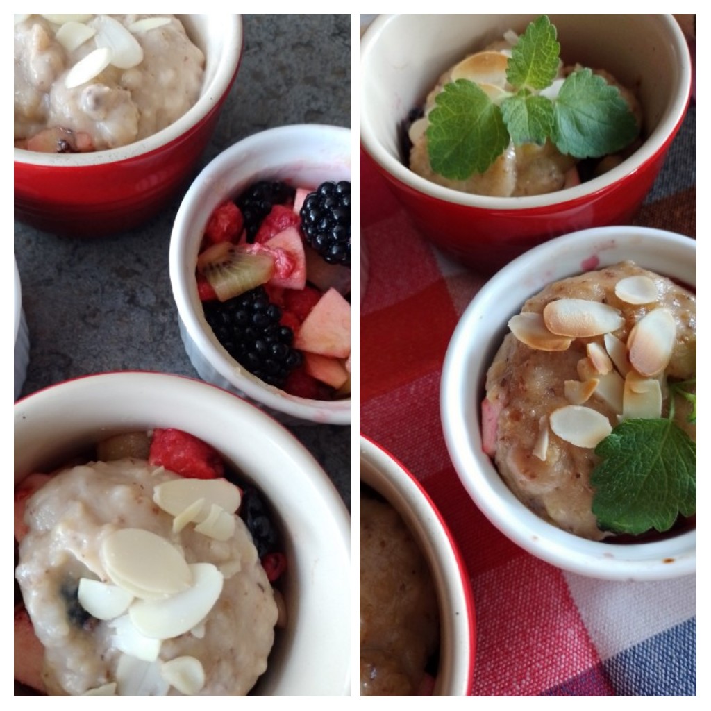 Alles in einem hohen Topf verrühren und erhitzen (nicht kochen) und währendessen mit dem Schneebesen dick schaumig schlagen. Vom Herd nehmen und weitere 2 Minuten schlagen. 40 g gemahlene Mandeln unterheben und über die auf Förmchen verteilten Früchte geben. Mit Mandelblättchen bestreuen und unter dem vorgeheizten Grill 2-3 Minuten gratinieren. Mit Melisse verziert servieren.