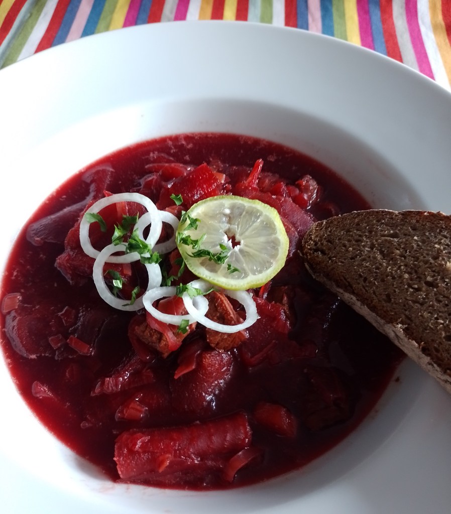 Gemüse putzen und klein schneiden, Fleisch waschen, salzen und in einen großen Topf mit kaltem Wasser legen. Gemüse, Pilze und Wacholderbeeren dazu geben, aufkochen und den aufsteigenden Schaum abschöpfen, ca. 1 Stunde köcheln lassen bis das Fleisch weich ist. Bereits vorgekochte Rote Bete schälen und fein hobeln, ebenso das Weißkraut. Zusammen mit dem Rote Bete Saft in den Topf geben und eine weitere 1/2 Stunde zugedeckt köcheln lassen. Das Fleisch heraus nehmen sobald es weich ist, in kleine Stücke schneiden und zurück in die Suppe geben, mit Salz, Pfeffer, Zucker und Zitronensaft abschmecken. Mit etwas Petersilie bestreut und Schwarzbrot servieren.