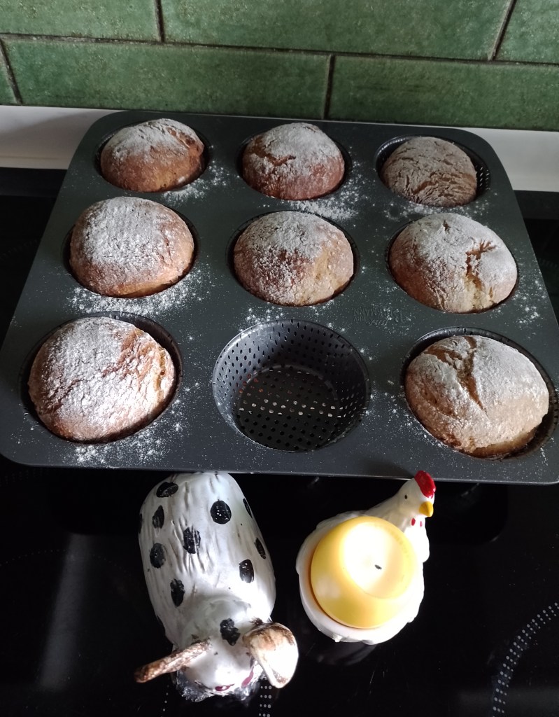 Geschälte Kartoffeln in dicke Scheiben schneiden und in einem Topf mit Wasser und 2 TL Salz weich kochen, Wasser abgießen, jedoch 80 ml auffangen. Kartoffeln etwas abkühlen und anschl. mit der Gabel zerdrücken. Lauwarme Kartoffeln, 1 TL Salz, Mehl, Hefe, Leinsamen, Olivenöl und das aufgefangene Kartoffelwasser mit dem Knethaken kurz auf niedriger, dann 5 Min. auf mittlerer Stufe zu einem glatten Teig verkneten, 60 Min. zugedeckt gehen lassen. Teig auf einer bemehlten Fläche flach drücken (nicht kneten) und in 9 gleich große Stücke teilen, mit Mehl bestäuben, zu Kugeln formen und in die mit etwas Öl eingefetteten Mulden legen, ein weiteres Mal mit Mehl bestäuben und zugedeckt nochmals 60 Min. an einem warmen Ort gehen lassen. Bei 200 Grad/180 Grad Umluft auf der mittleren Schiene ca. 40 Minuten backen. Noch kurz in der Form und dann auf einem Gitter auskühlen lassen.