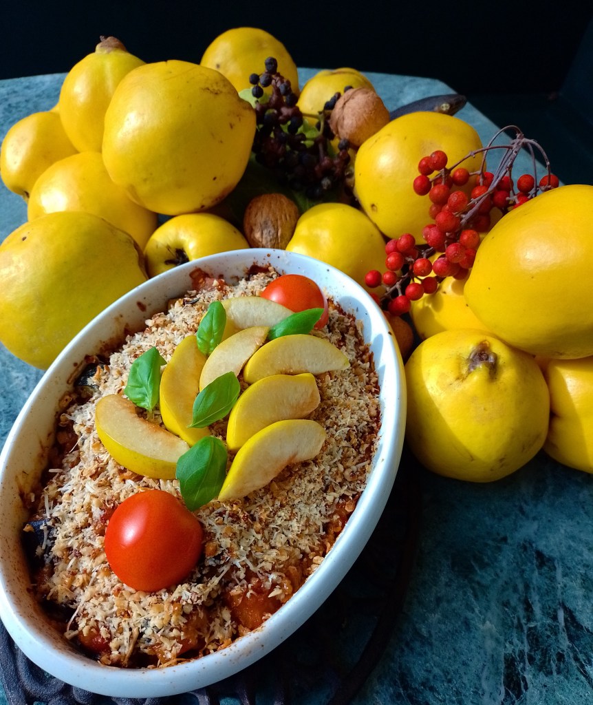 Fleisch in Streifen schneiden, kurz in etwas Olivenöl anbraten und würzen, beiseite stellen, ebenso das Gemüse mit wenig Brühe in 10 Minuten dünsten. Eine Form mit Butter ausstreichen, zuerst Fleisch, dann Gemüse reingeben, die mit dem Käse und den Nüssen vermischte Creme fraiche obendrauf und bei 200 Grad für ca. 20 Minuten in die vorgeheizte Röhre geben. Mit Quittenkompott (mein Quittenbaum trägt jedes Jahr sehr üppig und ich probiere immer wieder mal etwas Neues aus) garnieren und servieren.