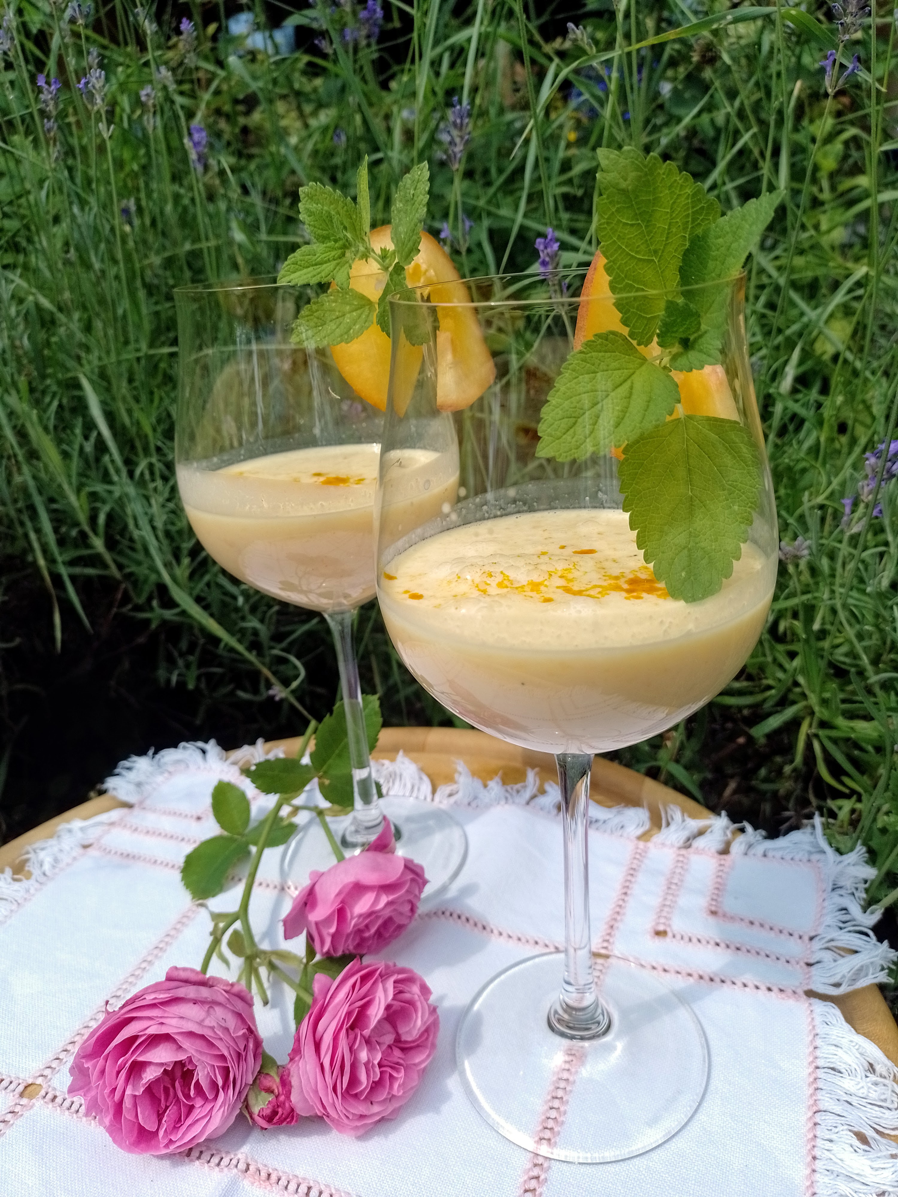 Pfirsiche waschen, 3 davon unten kreuzweise einschneiden, in einer Schüssel mit kochendem Wasser übergießen und 30 Sekunden darin ziehen lassen, mit kaltem Wasser abschrecken. Die Haut mit einem Messer abziehen, die Kerne herauslösen, Fruchtfleisch kleinschneiden und zusammen mit den übrigen Zutaten in einem hohen Gefäß mit dem Pürierstab fein pürieren oder mixen. Auf Gläser verteilen und mit dem in Spalten geschnittenen restlichen Pfirsich garnieren.