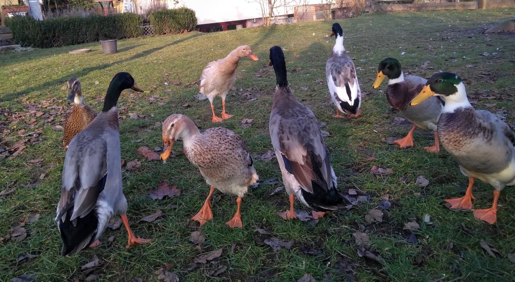Hier hat sich die Entenschar bereits auf 8, 3 Damen und 5 Herren vergrößert. Diese Konstellation ist keine einfache und entsprechend malträtiert werden die Damen. In der Tierwelt wird da unserer Ansicht nach etwas brutaler vorgegangen und ich muss gerade der älteren Entenfrau immer etwas zu Hilfe kommen. Bei der Paarung wird das Köpfchen manchmal sogar blutig gehackt und sie muss von den wilden Jungen separiert werden. Zum Glück habe ich verständige Nachbarn, die behilflich sind. Nicht nur in meiner Abwesenheit werden sie von ihnen mehr verwöhnt als versorgt, nein, sie dürfen sich in der schwierigen Zeit beim Nachbarn sogar verkriechen. Er hat eine Türe im Zaun geschaffen, die bei Bedarf geschlossen wird. Auch wird in dieser Zeit das Entenhaus geteilt. Der rabiate und jüngere Teil kommt auf die eine und der behäbigere, ältere auf die andere Seite. Im ausgehenden Frühjahr und den Sommer über ist das eine gut funktionierende Lösung auch wenn die jungen Erpel Möglichkeiten ausfindig machen und sogar über den Zaun fliegen um ihren Trieben nachgehen zu können – Tierwelt eben! Es gilt hier, wie sicher in der freien Natur noch viel mehr, der Schwächere hat weniger Chancen. Mobbing ist keine Seltenheit und auch kränkliche, alte Tiere werden ausgegrenzt und aus der Gruppe gedrängt. Trotzdem funktioniert das Zusammenleben mit etwas Unterstützung durch die „Entenmutter“ gut. Gerade jetzt marschieren wieder alle, jung und alt, gemeinsam durch den Garten auf der Suche nach dem mittlerweile rar gewordenen Fleischzusatz.